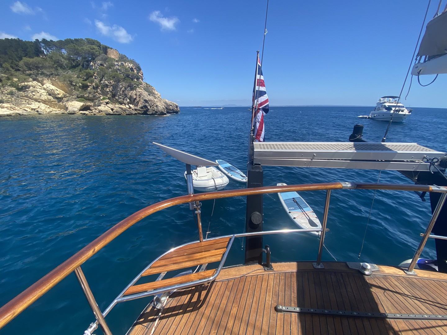 Electric winches, Jib, Battened mainsail, Furling genoa, Spinnaker boom, Fishing equipment, Cockpit cushions, Bathing platform, Kit wakeboard, Air compressor, Diving mask, Flippers, Gangway, Loudspeaker (outside), 2 sup's, 40hp tender, comes with wakeboard and waterski's, Kite board plus a 7, 9 and a 12 kite., Wing and foilboard.